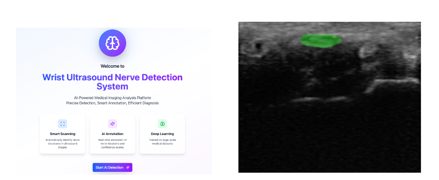 We collected and labelled the ultrasound images ourselves, then trained a lightweight deep learning model to segment the nerve. We also built a Python-based pipeline that processes live ultrasound video, uses the model to detect the nerve, and overlays a predicted green mask in real time.